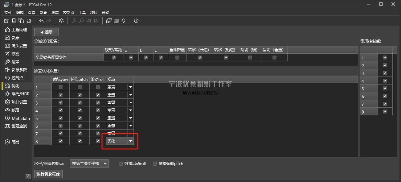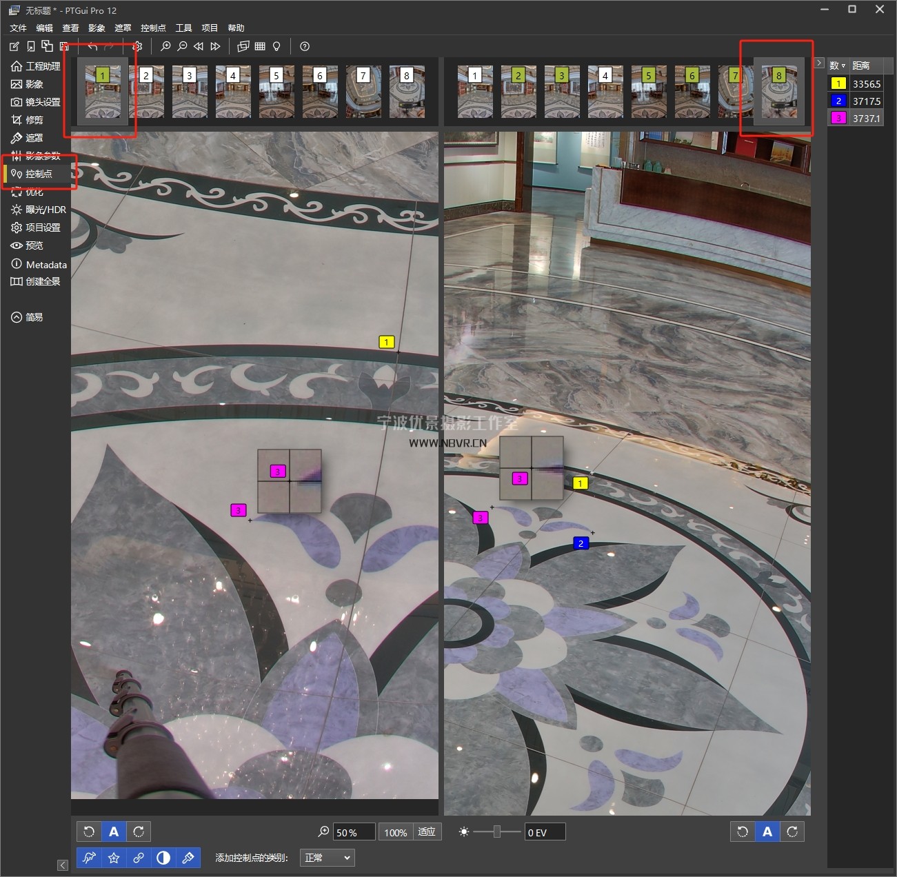 如上图:点击 “控制点” 按钮,出现分屏,分别找1和8,2和8....6和8的共同点,每组3个点左右。